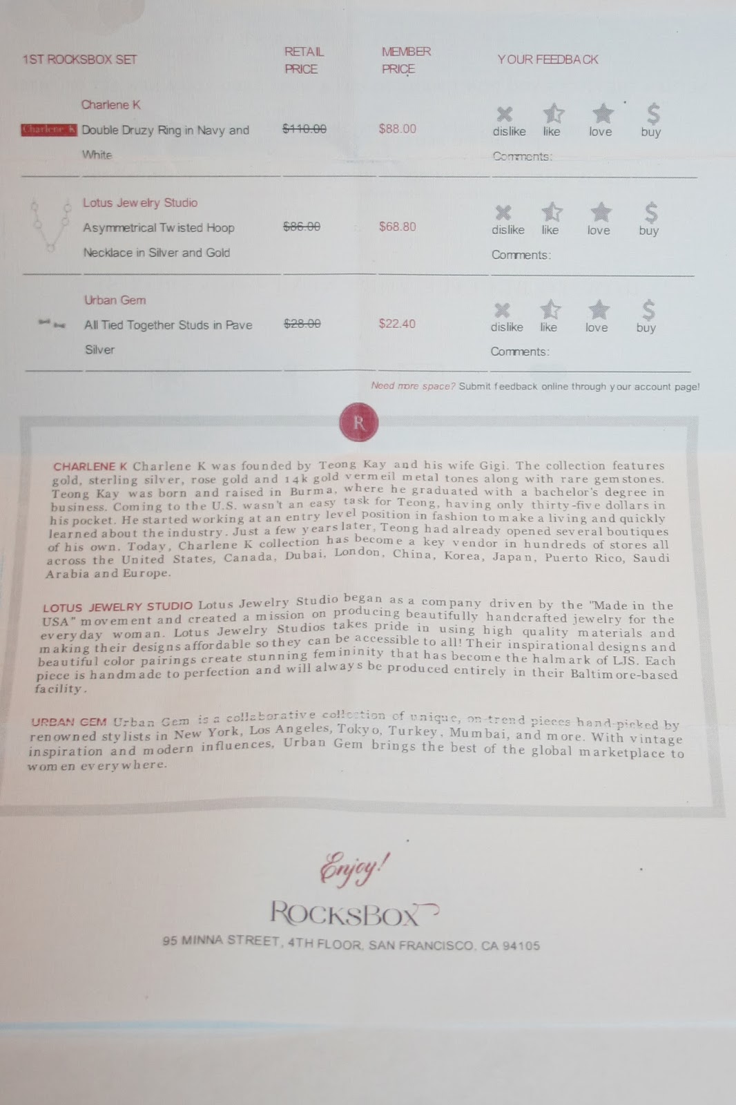 I copied and pasted my personal information from the top.  The list comes with a description of all three pieces.  You also check if you liked the piece, disliked it, loved it or want to buy it.  You can also write in comments about your pieces.