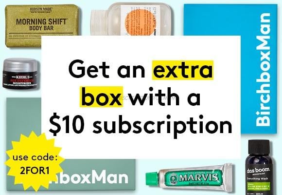 Birchbox Man is offering a FREE box when you buy a box. Use the coupon 2FOR1 to get a FREE Bonus box when you subscribe. Birchbox Man is $10.00/month and you will get 5 samples in each box.