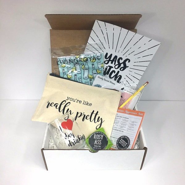 Smartass & Sass contains 4-8 items designed for snarky individuals and cynical a**holes. Boxes contain items like bags, pins, notebooks, mugs, and more.
